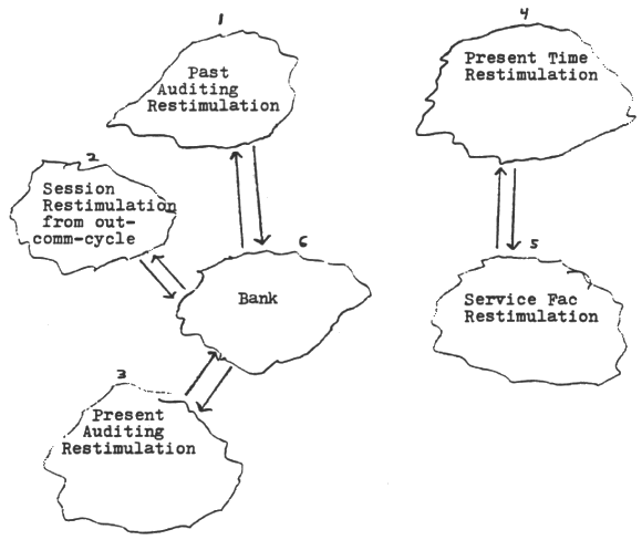 So, you have environmental restimulation sources in the present time (PT) environment and this restimulates the Ser Fac. You could draw out a picture of the bank and out of that draw an arrow, in other words, you just draw a big cloud and write the word "bank" and then you could draw an arrow up and a little cloud to the left, present auditing restimulation, then connect to that two more little clouds mid-way in the page and one of them could be "past auditing restimulation" and the other could be "session restimulation from being audited - out comm. cycle". Over to the right you could put "Ser Fac restimulation" and draw an arrow up to "PT restimulation". Now these two sets of clouds are interactive . Either the core Ser Fac can be touched upon or one could foolhardedly attempt to knock out the bank. So, what you are going to touch on, on this, is the Ser Fac restimulation. The Ser Fac is what keeps the environmental restimulation going. It also has great bearing on the amount of session restimulation and it will block current destimulation in the session. The clouds can be erased off in the numbered sequence indicated.
