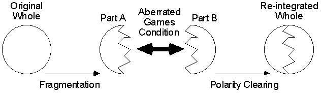 Our underlying philosophy here is that something that was whole has been split up into a dichotomy of two parts or polarities. That split creates an ongoing games condition between the two parts. Our objective is to re-integrate those two parts with each other. Our plan is to first recognize that they are there and then working out what it is that is keeping them apart.